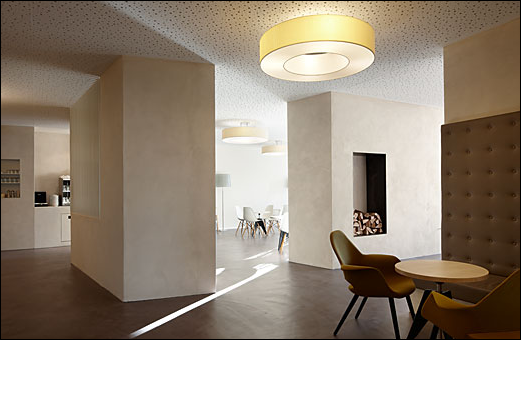 Das Foyer und die Aufenthaltsbereiche im Erdgeschoss werden räumlich neu zusammengefasst. Von der Ortogonalen abweichende Raumkörper gliedern den Gesamtraum in unterschiedliche Raumzonen. Diagonale Sichtbeziehungen zwischen den einzelnen Aufenthaltsbereichen schaffen Transparenz und Übersichtlichkeit. Sitznischen- und bänke laden zum Verweilen ein. Materialien und Oberflächenfarben schaffen zusammen mit der dezenten Beleuchtung ein stimmungsvolles Ambiente.