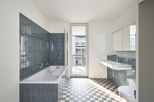 Eine Besonderheit bilden die jeweils vier Attikawohnungen, welche sich über 2 Geschosse verteilen. Mit dieser Organisation wird das privilegierte Attikageschoss ausschliesslich durch Wohnräume besetzt und für mehr Wohnungen erlebbar gemacht.