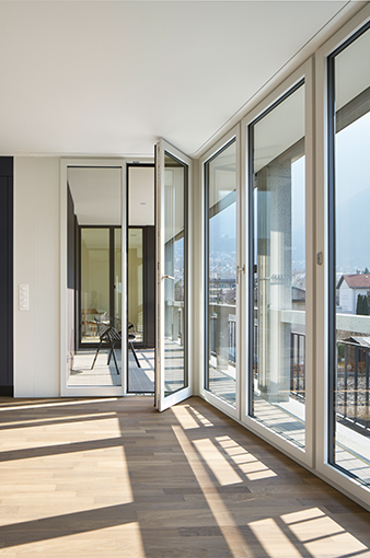 Eine Besonderheit bilden die jeweils vier Attikawohnungen, welche sich über 2 Geschosse verteilen. Mit dieser Organisation wird das privilegierte Attikageschoss ausschliesslich durch Wohnräume besetzt und für mehr Wohnungen erlebbar gemacht.
