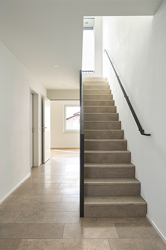Neben der Gestaltung des Übergangs von Privatheit zu Öffentlichkeit in der Gebäudehülle wird dem gleichen Thema im Zusammenhang mit dem Zugang der Wohneinheiten besondere Aufmerksamkeit geschenkt. Über den gedeckten Eingangsbereich, die Eingangshalle und den Glaslift im grosszügig belichteten Treppenhaus gelangt der Bewohner über eine spezifische Farbigkeit zu seinem privaten Wohnraum. Die beiden Häuser sind identisch organisiert, sie unterscheiden sich nur in ihrer Farbgebung, in der inneren, wie in der äusseren Erscheinung.