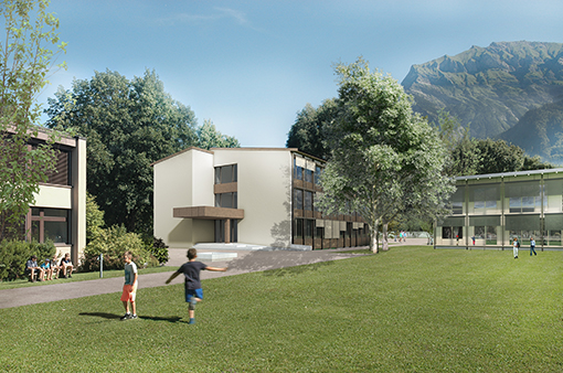 Für die „Oberstufe“ (Kreisschule) und die „Kinderbetreuung Plus“ werden Neubauten vorgeschlagen. Diese Neubauten ergänzen den campusartigen Charakter der bestehenden Anlage auf unscheinbare aber eigenständige Weise und verdeutlichen die Qualitäten des Freiraumes der bestehenden Anlage. Die äussere Gestalt der Neubauten unterstützt das Zusammenspiel mit dem Bestand zu einer harmonischen Gesamtanlage.